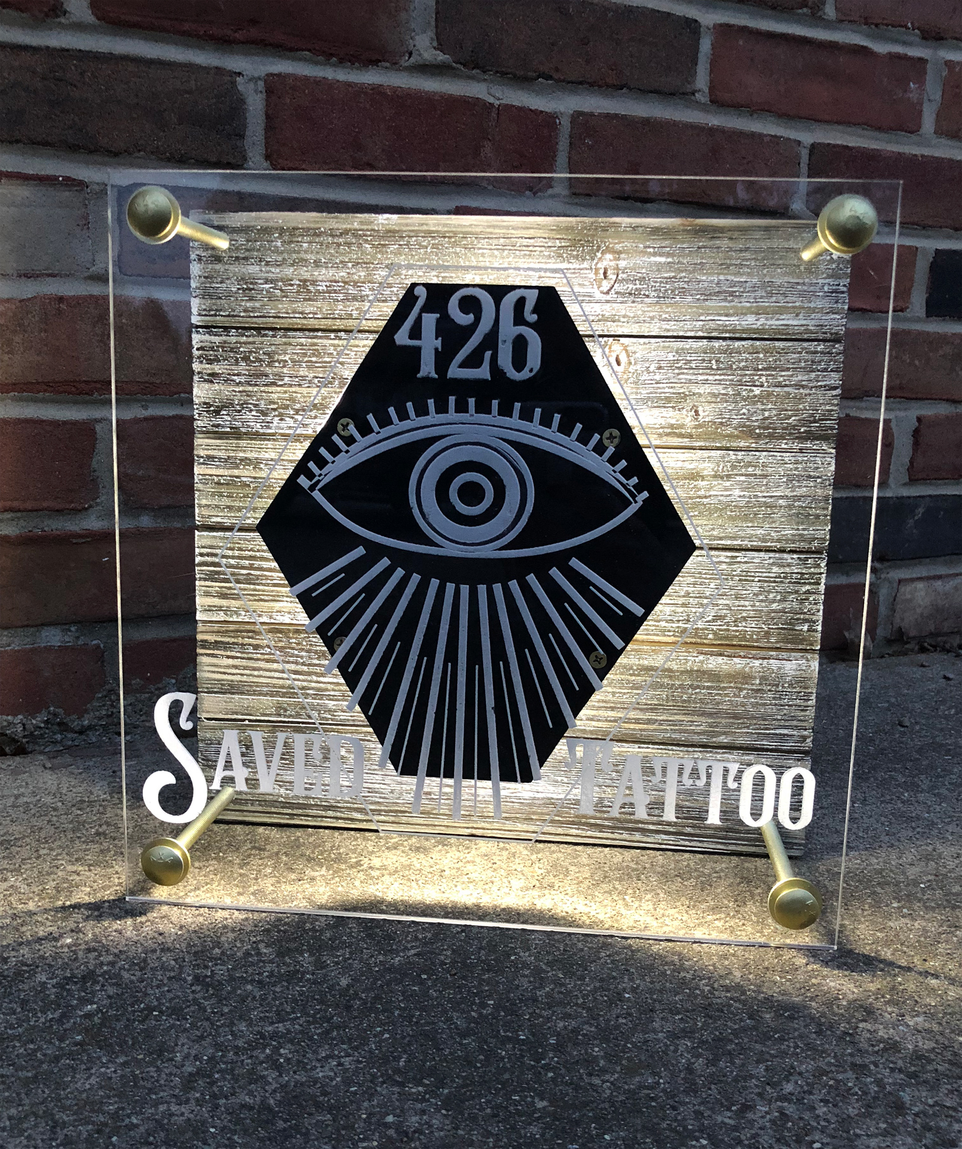 Custom gold foil invitation and shop sign for a wine tasting event at Saved Tattoo.